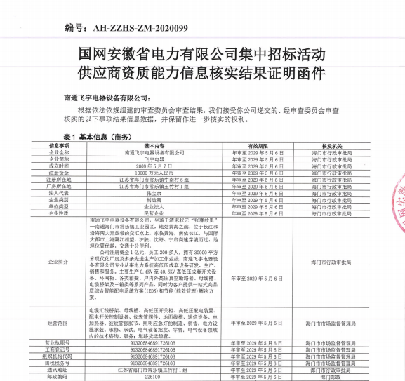 2020年6月10日, 我公司顺利通过国网安徽省糖心vlog力有限公司低压开关柜的供应商资质能力核实,获得《供应商资质能力核实证明》(简称“一纸证明”)。